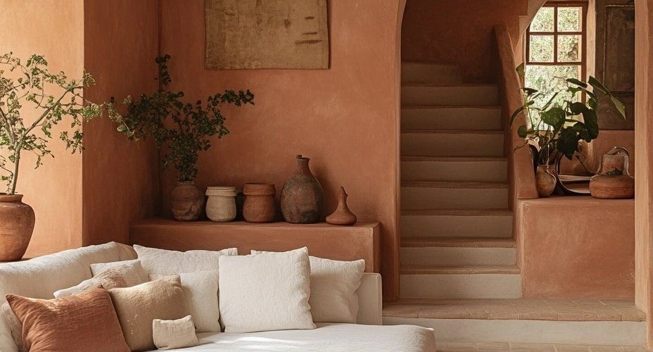 Tonos como terracota, arena, verde oliva, arcilla y marrón cobraron protagonismo. Estas paletas transmitieron calma y conexión con la naturaleza, dando profundidad y calidez a cualquier espacio.